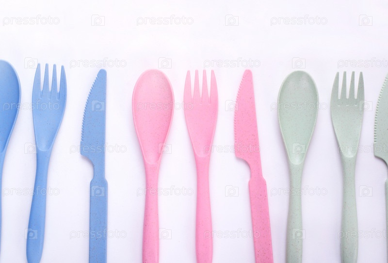 Набор столовых приборов пастельных тонов из пшеничной соломы подряд на белом фоне. Многоразовая посуда. Концепция школьного обеда