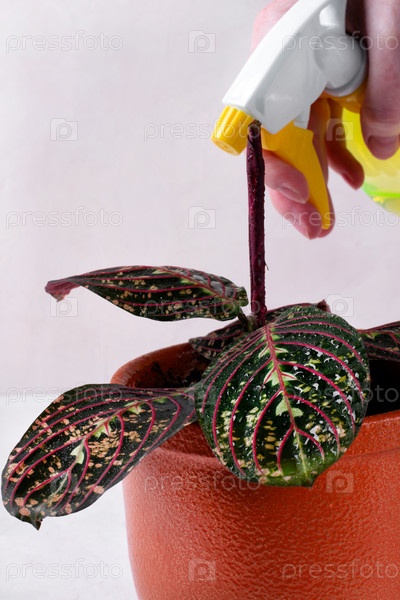 Маранта или молитвенное растение с поврежденными солнечными ожогами листьями в горшке. Опрыскивание комнатного растения в горшке