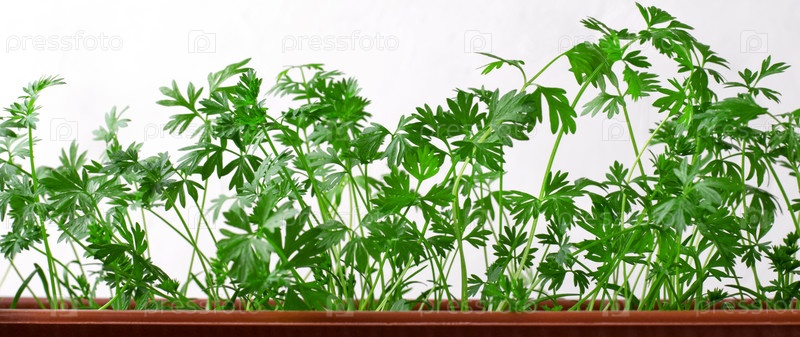 Морковное растение в коричневом горшке на белом фоне. Выращивание овощей дома