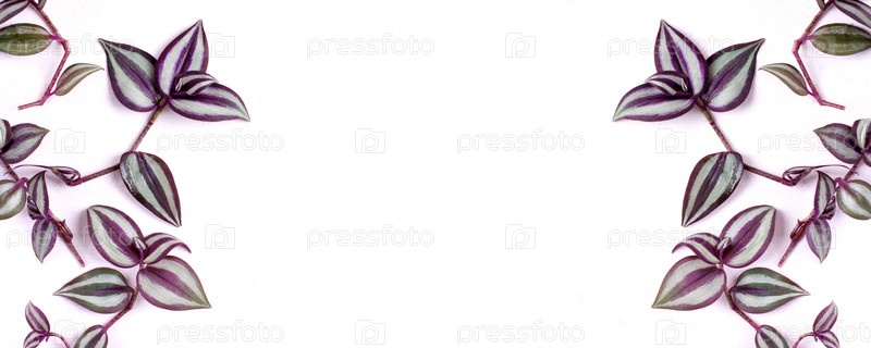 Веб-баннер с Tradescantia zebrina или серебристыми дюймовыми листьями растений на белом цвете с копировальным пространством. макет для цветочного магазина или поздравительной открытки