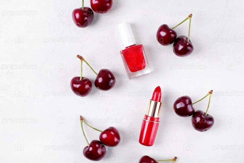 Красная помада и лак для ногтей на белом фоне с вишней. Косметика