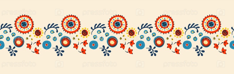 Набор этнических элементов. Бордюр представляет собой полосу с цветами, листьями, ветками, вензелями. Народная вышивка. Славянский, украинский, русский мотив. Хохлома, матрешка, дымковская игрушка. Мексиканский, индийский, цыганский ковер. Вязаное кружево