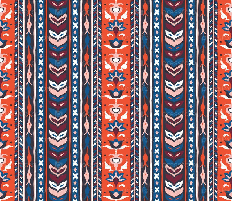 Геометрический дамасский орнамент. Икат границы. Этническая вышивка с листьями и монограммами. Племенная векторная текстура. Бесшовный народный узор в ацтекском стиле. Индийский, скандинавский, цыганский, мексиканский, африканский ковер