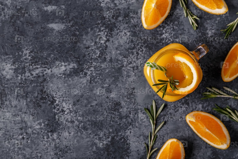 Свежие спелые апельсины и сок на каменном столе