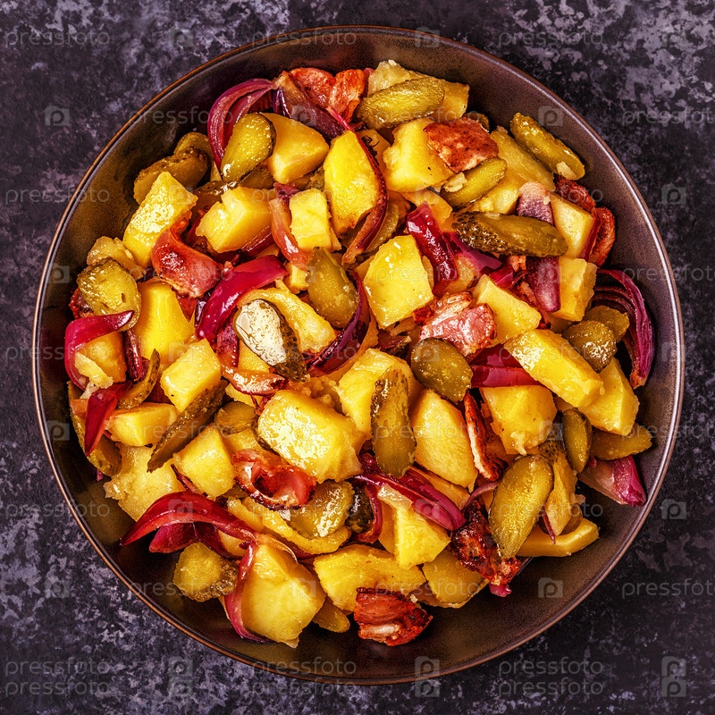 Домашний картофельный салат с беконом и солеными огурцами