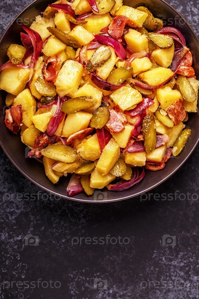 Домашний картофельный салат с беконом и солеными огурцами