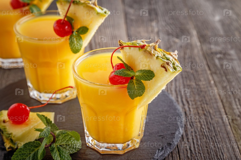 Стаканы ананасового сока с кусочками ананаса, коктейльной вишней и мятой на деревянном столе