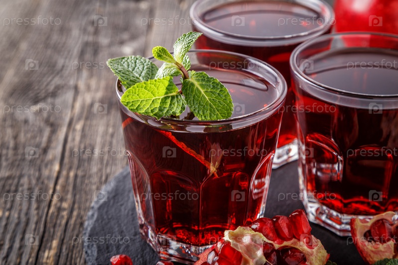 Стаканы гранатового сока со свежими фруктами граната и мятой на деревянном столе