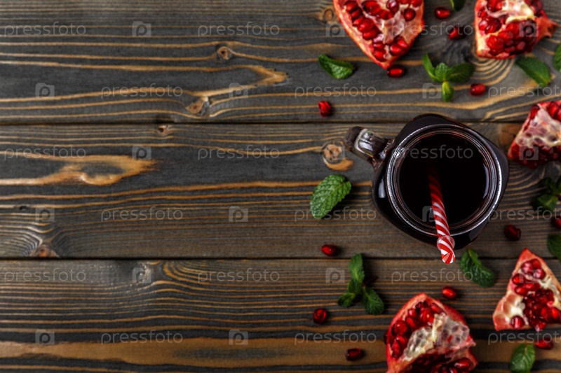 Стакан гранатового сока со свежими фруктами граната и мятой на деревянном столе