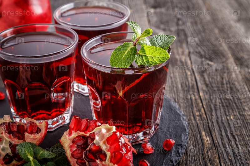 Стаканы гранатового сока со свежими фруктами граната и мятой на деревянном столе