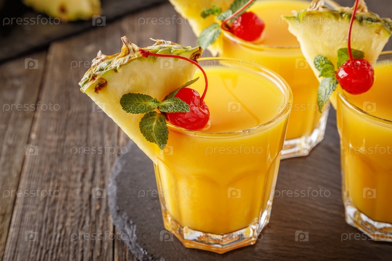 Стаканы ананасового сока с кусочками ананаса, коктейльной вишней и мятой на деревянном столе