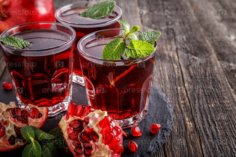 Стаканы гранатового сока со свежими фруктами граната и мятой на деревянном столе
