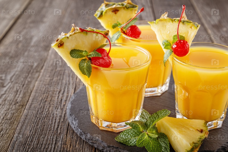 Стаканы ананасового сока с кусочками ананаса, коктейльной вишней и мятой на деревянном столе
