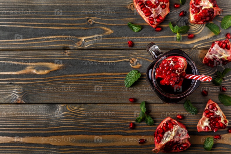 Стакан гранатового сока со свежими фруктами граната и мятой на деревянном столе