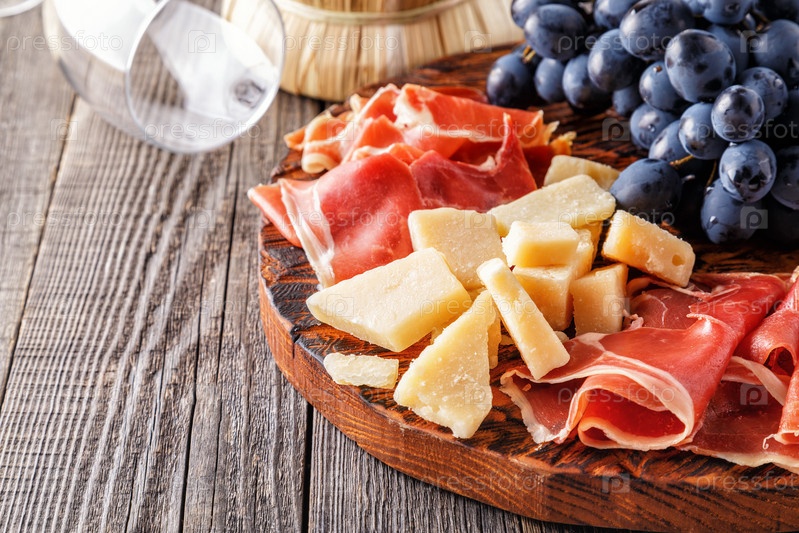 Прошутто, вино, виноград, пармезан на деревянном столе