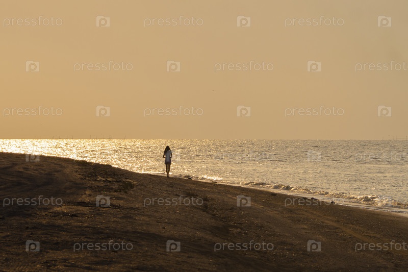 Силуэт молодой туристки на прогулке, идущей по песчаному пляжу и смотрящей на море во время красочного заката. Силуэт девушки, идущей по песчаному пляжу моря во время заката