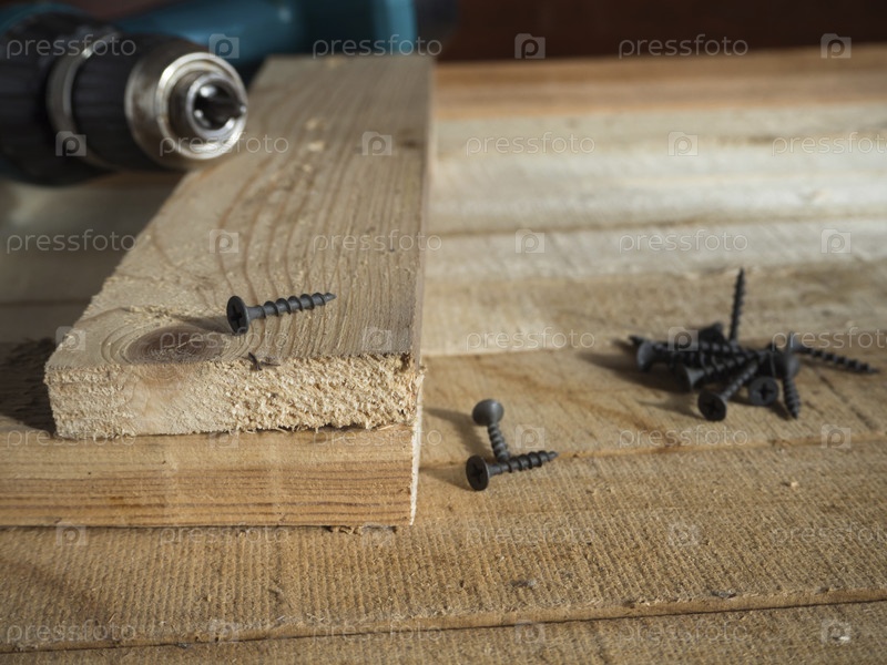 Саморезы для деревянных досок и аккумуляторная дрель-шуруповерт, деревянные доски. Инструменты и винты на столе. Выборочный фокус. Место для копирования.Ремонт или строительство дома