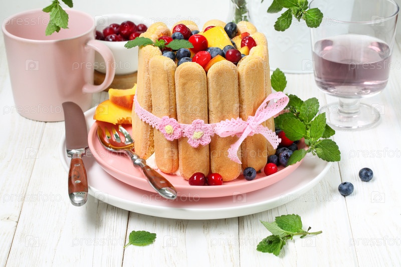 Тирамису с персиком,голубикой и клюквой на белом фоне