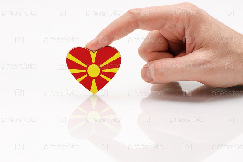 Флаг Македонии. Любите и уважайте Македонию. Мужская рука держит сердце в форме македонского флага на поверхности белого стекла. Концепция македонского патриотизма и гордости