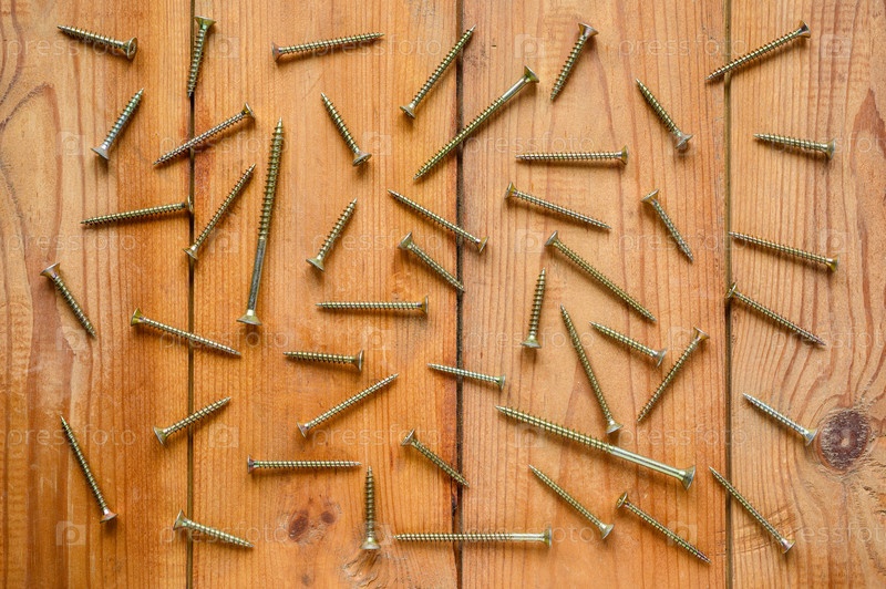 Много новых винтов на деревянном фоне. Фон на строительную тему. Вид сверху