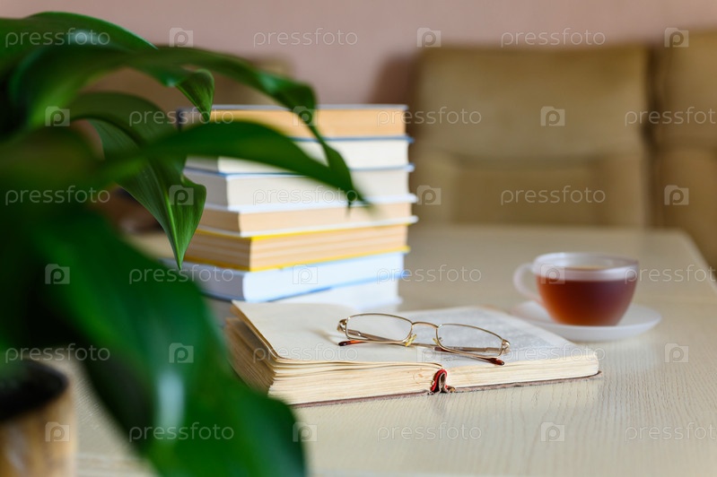 Чтение бумажных классических книг. Открытая книга с очками на столе в комнате. На заднем плане травяной чай и стопка книг. Селективный фокус на старой книге