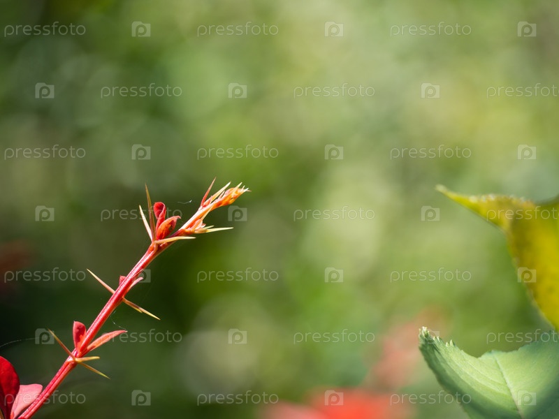 Молодая ветка барбариса. Колючая красная ветка на размытом зеленом фоне