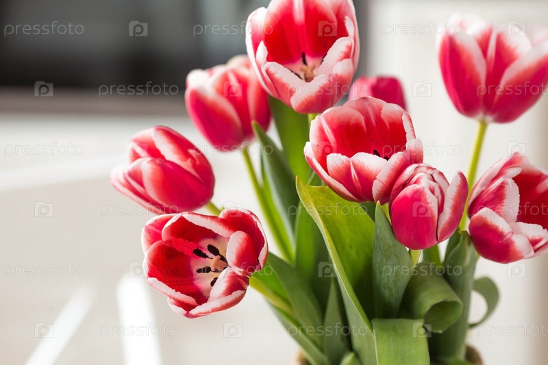 Букет тюльпанов в вазе. На заднем плане интерьер белой кухни в скандинавском стиле. Концепция домашнего уюта и Международный женский день 8 марта