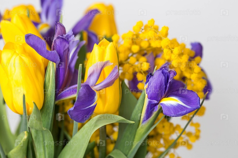 Букет из желтых тюльпанов, мимозы и фиолетовых ирисов на белом изолированном фоне. Концепция наступления весны и Международного женского дня 8 марта