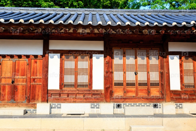 Традиционная корейская архитектура, каменная стена с деревянной дверью во дворце Кенбоккун, Сеул, Южная Корея