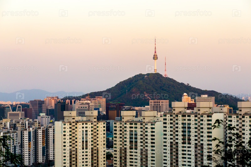 Прекрасный вид на башню Намсан на закате, Сеул, Южная Корея