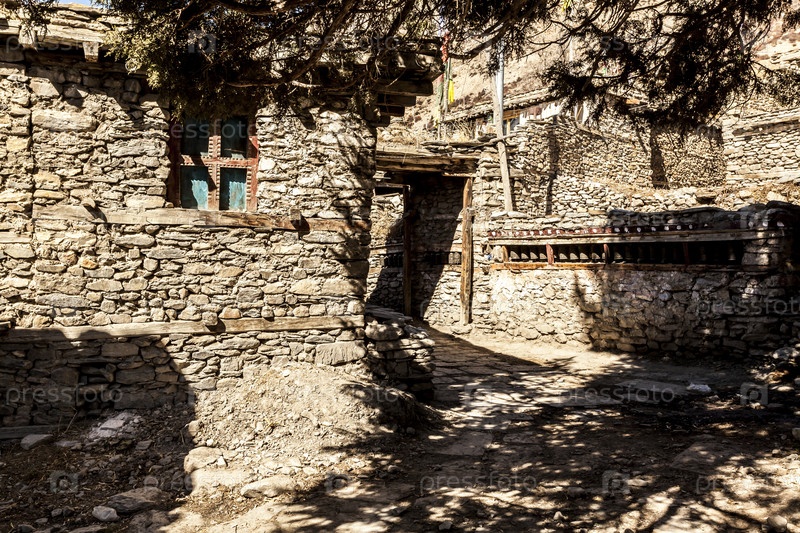 Узкая улица в Мананге - горной деревне в Непале. Гималаи, заповедник Аннапурны