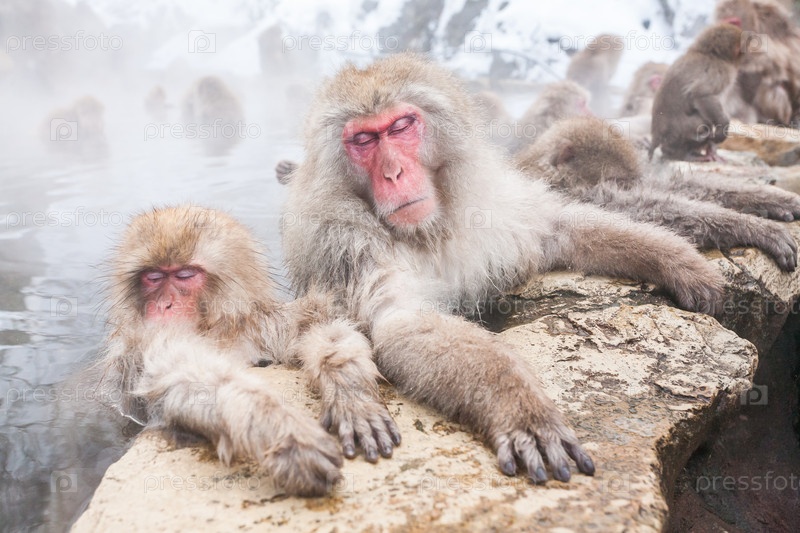 Группа снежных обезьян, спящих в горячем источнике, Япония