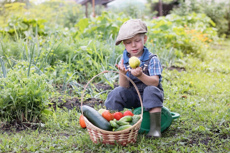 Маленький мальчик с фермы в саду с корзиной овощей. Мальчик на улице в саду