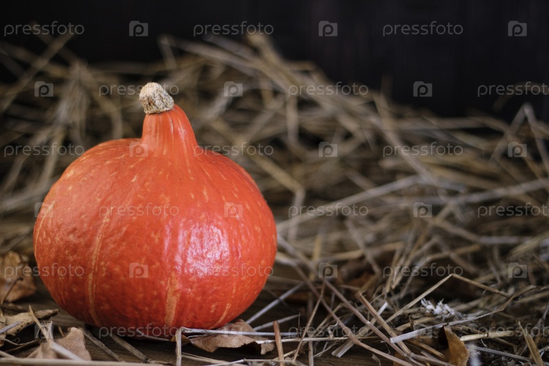 Крупный план тыквы на сене на темном деревянном фоне. Осенний фон. Фон для Хэллоуина