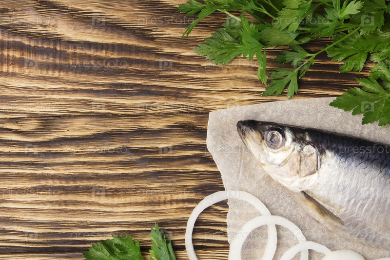 Соленая сельдь с луком и петрушкой на фоне старых деревянных. Свежая рыба Сельдь