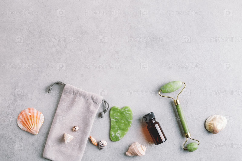 Нефритовый ролик для лица, массажный камень гуа ша, масло для лица и натуральные ракушки на сером фоне с копией пространства