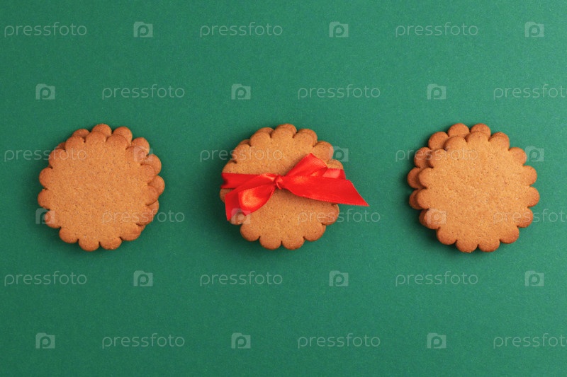 Пряники с красной лентой на зеленом фоне, вид сверху