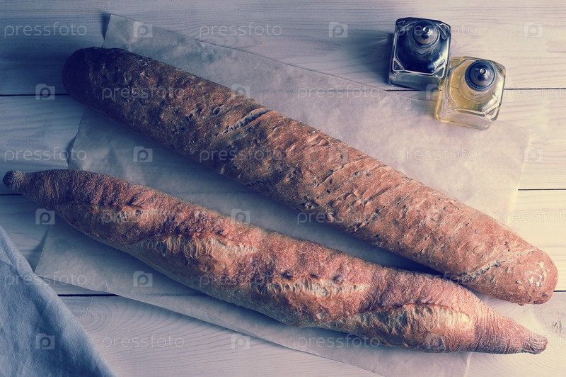 Два багета на крафт-бумаге на деревянном деревенском фоне