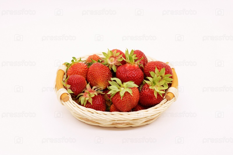 Композиция из спелой клубники на белом фоне в плетеной корзине