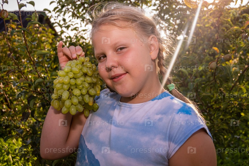 Девочка держит в руках гроздь винограда