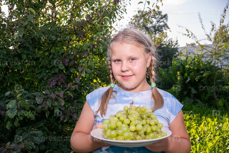 Девочка держит в руках гроздь винограда