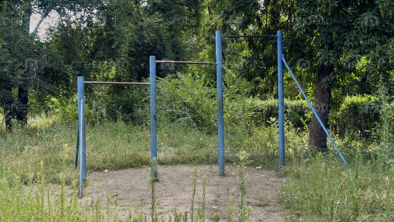 Турник во дворе заброшенной в советское время школы, заросший кустами и травой