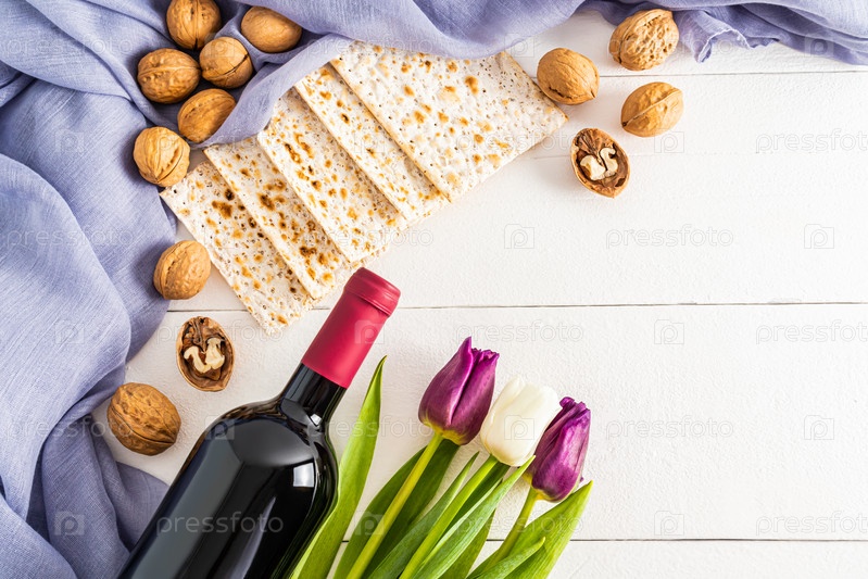 Праздничный фон для еврейской пасхи с мацой, грецкими орехами, бутылкой красного вина и цветами. плоская кладка. место для текста. белые деревянные доски