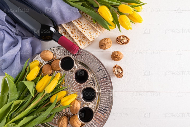 Круглый серебряный поднос с бокалами красного вина, маца, грецкие орехи, бутылка вина. плоская планировка. концепция еврейского праздника Пасхи. копировать