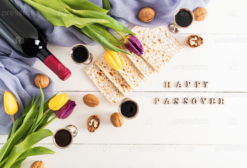 Праздничный фон с традиционными угощениями к еврейскому празднику Пасхи. Белый деревянный фон с письмами счастливой пасхи и цветами