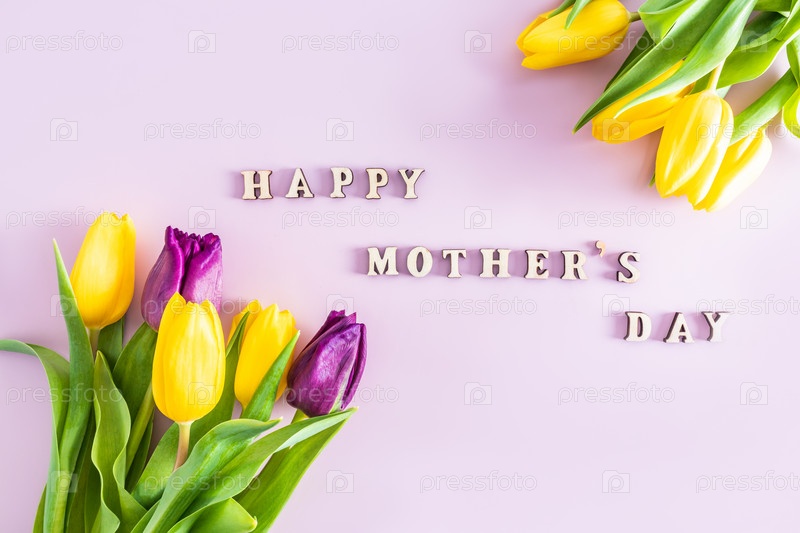 Желтые и фиолетовые тюльпаны на фиолетовом фоне с текстом деревянными буквами счастливого дня матери. вид сверху. плоская планировка