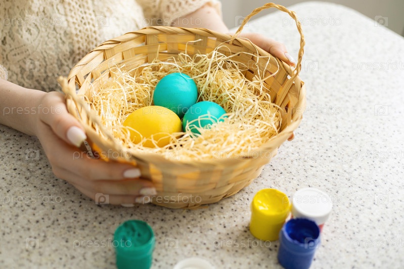 Крупный план рук девочки, держащей плетеную корзину с крашеными яйцами. Рядом на столе лежат краски. Пасха