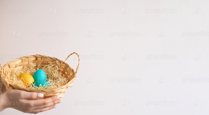 Девушка держит плетеную корзину с крашеными яйцами. Пасха