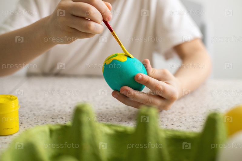 Руки ребенка, красящего яйца кистью. Рядом краски и плетеная корзина. Крупный план. Пасха