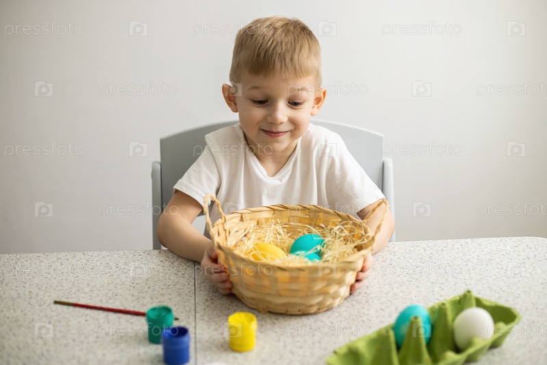 Ребенок, сидящий за столом на белом фоне, держит плетеную корзину с крашеными яйцами. На столе лежат кисти и краски. Пасха